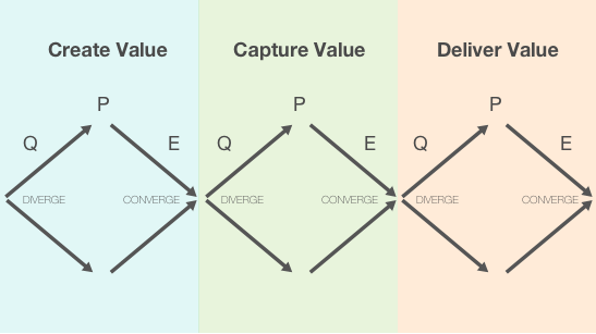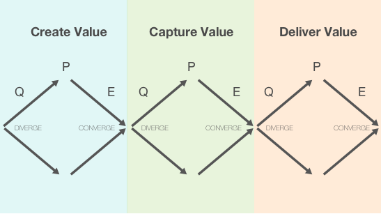 When creating, capturing, and delivering value, your group should take a divergent approach creating many different ideas and options, before converging on a preferred solution. This design thinking approach creates more opportunity for innovation in the business model development than with comparative methods like the Lean Canvas or the Business Model Canvas from my experience.