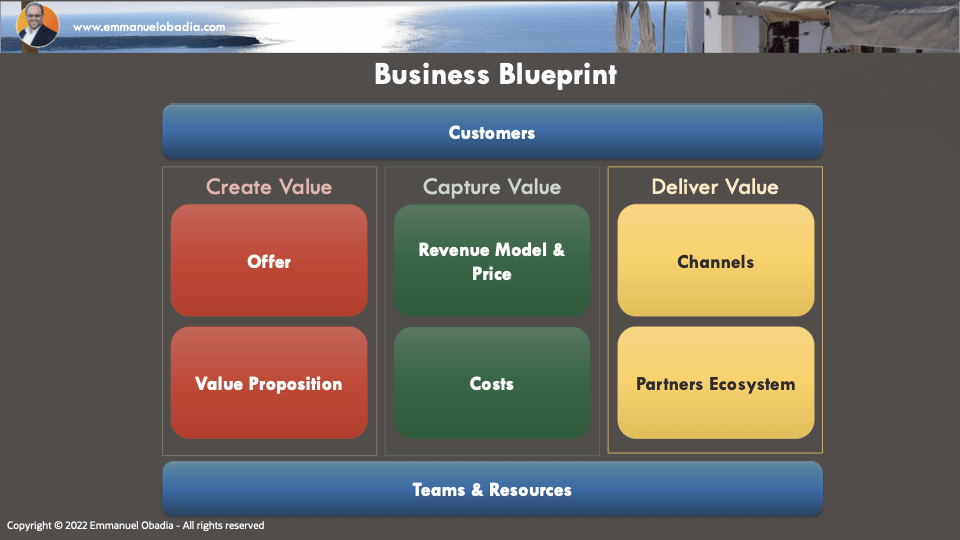 In a nutshell, the framework invites the business designer team to rapidly prototype how the business will create, capture, and deliver value. So let me help you picture this, put some words and your brain around it.