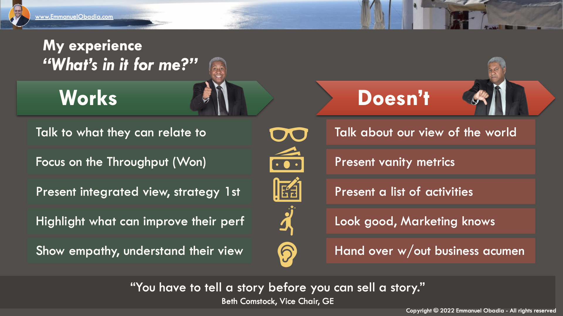 - Talk about what they can identify with, rather than Talk about our vision of the world: their territory, their accounts, rather than the market, at all levels starting with the Sales VP.