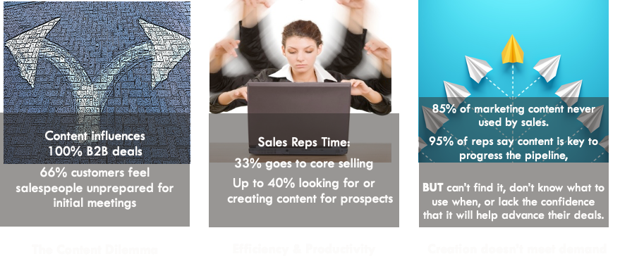 Sales demands content and marketing has content, but resources still go to waste: Marketing creates a ton of great content, but 85% of marketing content is never used by sales. At the same time, 95% of reps say content is essential to progress prospects through the pipeline, but they can’t find it, don’t know what content to use when, or lack the confidence that it will help advance their deals. This lack of communication and alignment causes organization-wide disconnects, missed opportunities, and lost revenue.