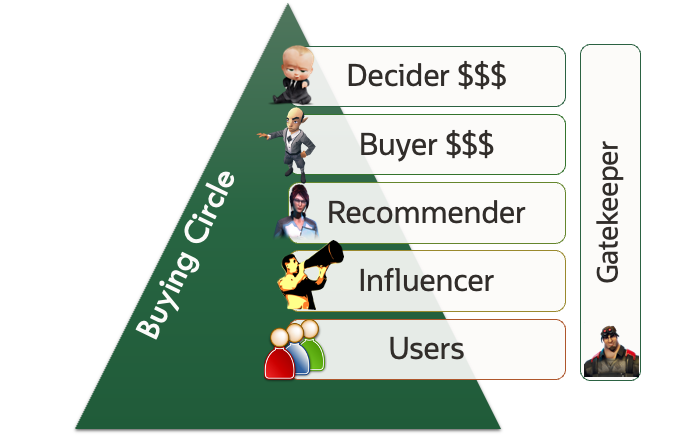 The B2B Buying Circle, or typical member of the buying team, decision-making body or buying center is the term used to describe all those stakeholders who have direct or indirect influences on the buying decision for your product or service. The term Decision-Making Unit (DMU) or Demand Unit is also often used. In B2B, this group ranges from 5 to 17 individuals depending on the size of the business you’re dealing with and the importance of the deal. The following roles can typically occur, in chronological order: