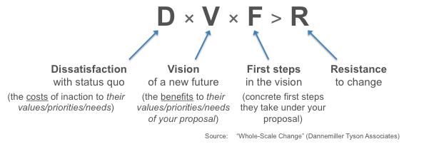 I have been involved in several major changes of business model from on-premise or transactional based, to SaaS or subscription-based model when acting as a Chief Product Officer or Vice President of Marketing with major vendors (Sun Microsystems, Sage, Salesforce, and Oracle). I must admit, that rapid change was one of the appeals to working in Big Tech for me. I was thrilled when given the opportunity to present to large audiences, whether internally or to customers and partners, to motivate the change at stake. In those days, I was not familiar with the formula but in hindsight, I can recognize when I did not highlight one of the ingredients enough which resulted in delays or failure.