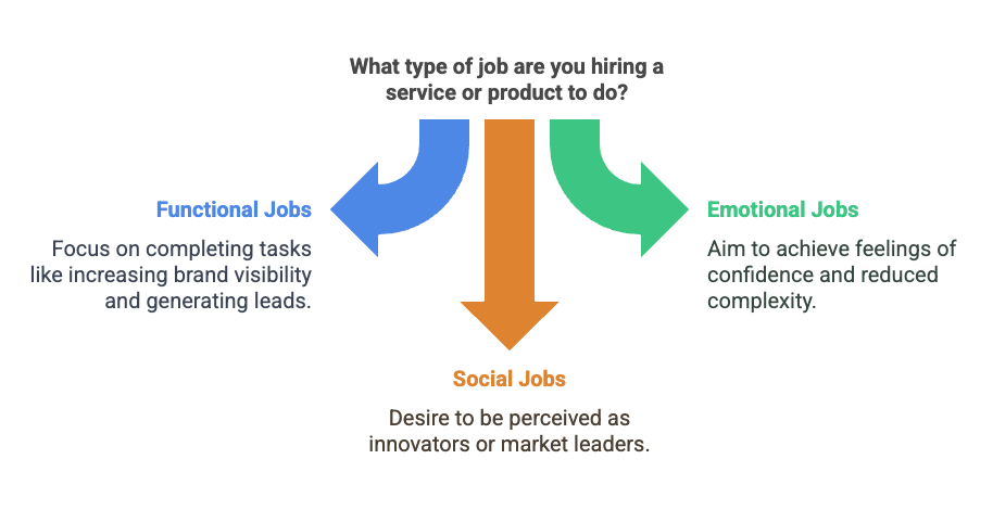 - Functional Jobs: What tasks are they trying to complete? (e.g., increasing brand visibility, generating qualified leads.)