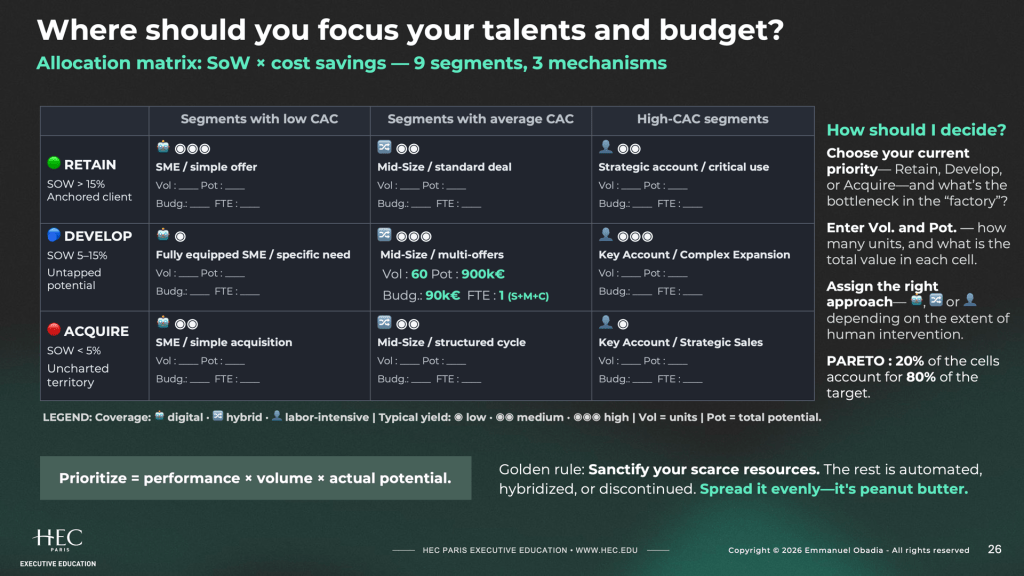 Revenue Architecture is the operating design behind scalable, predictable commercial growth. It covers five decisions: where to concentrate commercial energy, which accounts to retain, develop or acquire, where handoffs break between marketing, sales and customer success, what leaders inspect and coach, and which metrics predict future performance rather than report past activity.